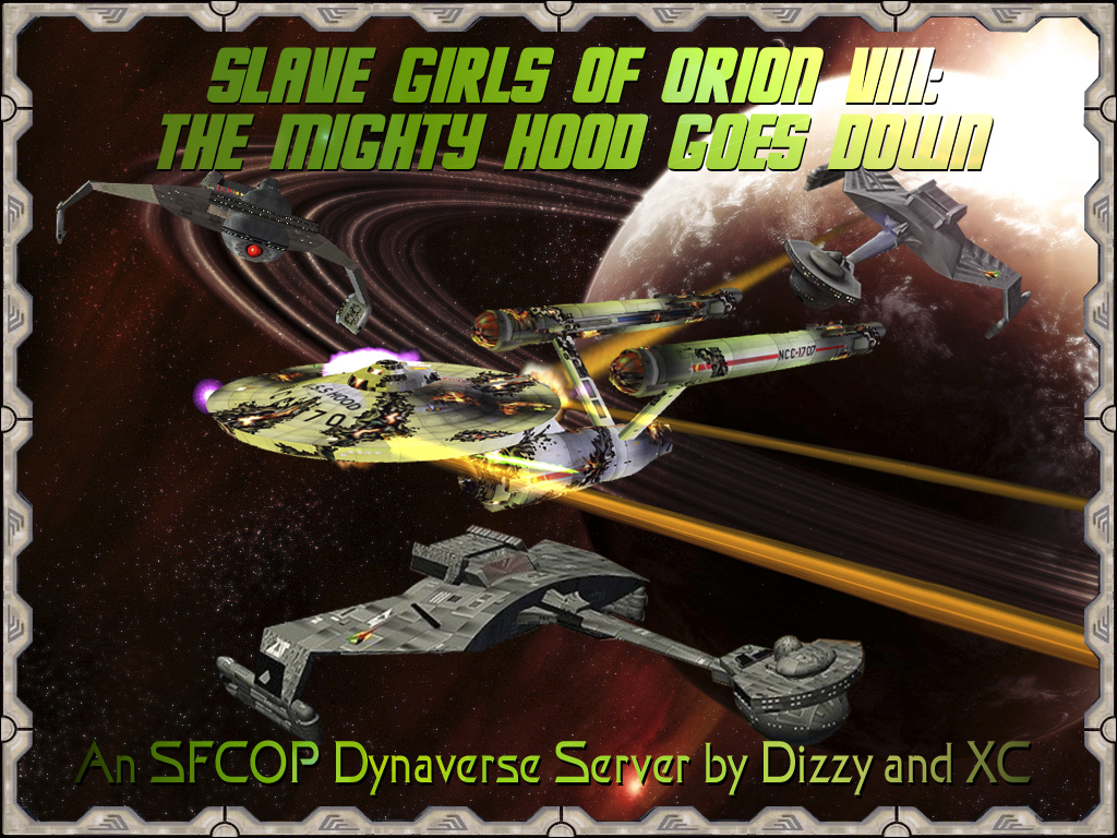 Slave Girls of Orion VIII: The Mighty Hood Goes DownIn 2271 The Klingon declaration of war arrived in the Federation council chambers almost simultaneously with the first battle reports. Among these reports was one that brought particular anguish. The heavy cruiser Hood, patrolling along the Klingon border, had not reported since the attack began and was feared destroyed. Coinciding with the dissappearance of the Organians at the hands of the Orion Slave Girls, the long planned attack on the Federation was well under way. It wouldn't be long before the war escalated and brought in all the surrounding empires in a struggle for dominance and survival.